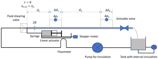 Knowing the viscosity and the shear rate at the wall at any position along the pipe, it is possible to calculate the pressure gradient at each location using Equation (1). In order to apply Equation (7), it is necessary to know the value of the structure parameter at the entrance of the pipe, . A possible solution is to ensure that the fluid is completely unstructured when it enters the pipe section. This can be achieved by placing a nozzle or a valve that creates a sufficient pressure drop to fully shear the fluid. In that case, is equal to , i.e., the structure parameter is in complete unstructured conditions (see Figure 2).
