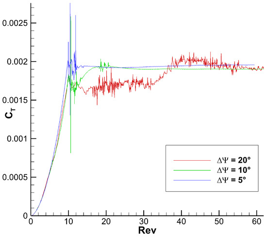 Our initial implementation of the UVLM-VPM had trouble with discretization refinement. Figure 1 shows this issue, wherein keeping everything else equal, changing the time step changed the global coefficients convergence significantly. In the previous work [5], the refinement study was performed simultaneously for the blade mesh and the time step thus avoiding that issue. The refinement problem in our previous implementation was caused by an error of understanding concerning the overlapping factor.