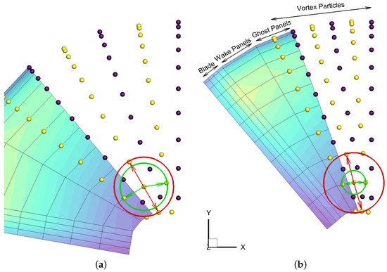 Visualization of the overlapping factor for the vortex particles. (a) . (b) . Each wake panel edge is replaced by one particle. The trailing particles are shown in yellow and the shed particles in purple. The arrows represent the core size selection for two different overlapping interpretations. In red is shown the core size selection of a trailing particle when the farthest neighbor is selected for the overlapping condition. In green, only the previous and next particles are selected for the overlapping condition. Only the green selection of the core size is properly adjusted to account for the new particles distance when the time step is changed at constant blade mesh.