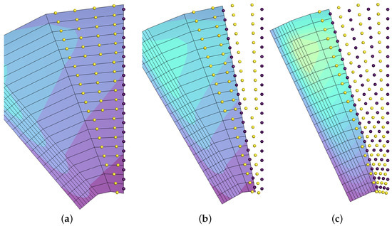 Visualization of the increase of the number of particles at a coarser time step to imitate the distribution at the finest time step. (a) with 4 chordwise particles per iteration. (b) , with 2 chordwise particles per iteration. (c) , with 1 chordwise particle per iteration.