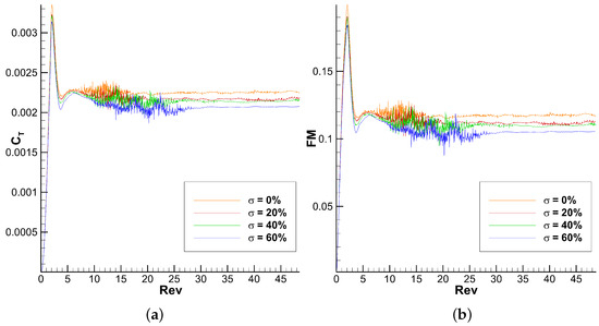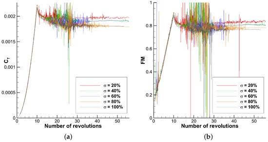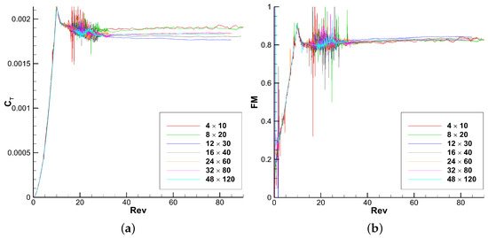 3D URANS convergence of the global coefficients with the number of revolutions for the different meshes. (a) Coefficient of thrust (). (b) Figure of Merit (FM).