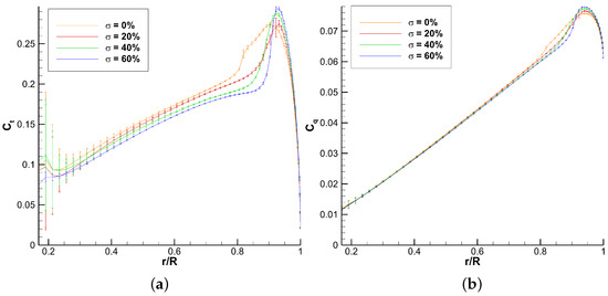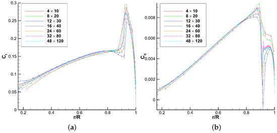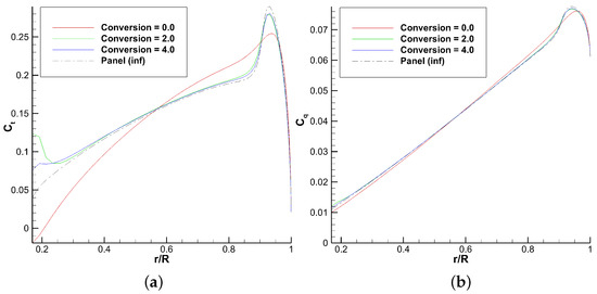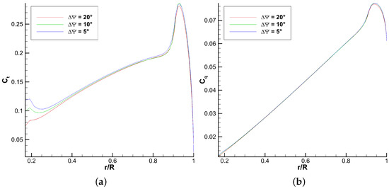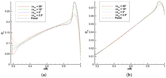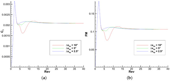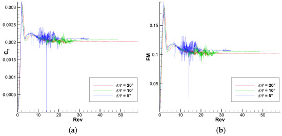 The present work is more focused on the sensitivity study of the method since the validation with other studies was performed in the previous work. Therefore, the comparison with higher fidelity results is performed on a single point. The and differences can be found in Section 6.2. They are reported as a range because they depend on the inputted database. Section 6.2 compares the thrust, torque, and twisting moment span loading with the higher fidelity results. The tip vortex position is compared with the Kocurek empirical formulation [30] in the sensitivity study, but is not validated with the higher fidelity results. and FM convergence figures are shown for each parametric change in this study.
