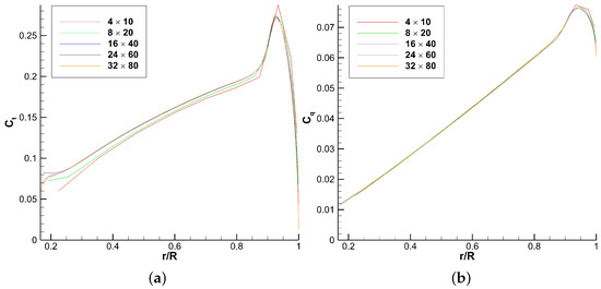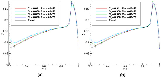 The UPM-VPM of Tan and Wang [16] is validated only with coefficient of pressure () sections compared with higher fidelity and experimental results. They decided to show results at the same blade collective angle (8°) and 3 different RPM (1250, 1500, and 1750). Experimental data are provided (r/R = 0.5, 0.68, 0.80, 0.89, and 0.96) on each case. They show some sections for each case, without stating how those sections are chosen. For the RPM = 1250, r/R = 0.68 and 0.96 are shown. Three sections are shown at RPM = 1500: r/R = 0.68, 0.80, and 0.89. The RPM = 1750 shows the same sections as the RPM = 1250 simulation. The validation does not include any convergence plot.