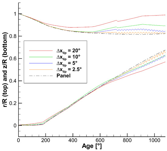 - Time discretization refinement (time step, ):where is the azimuthal increment per time step in degree, is the time step in seconds and is the rotational speed in degree per second. It was previously performed jointly with the geometry discretization refinement;