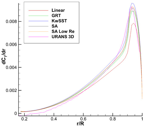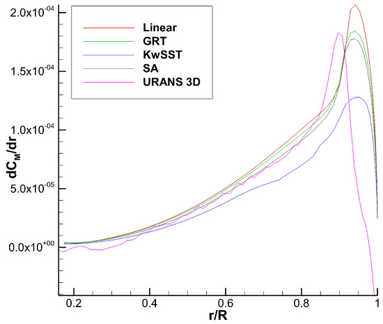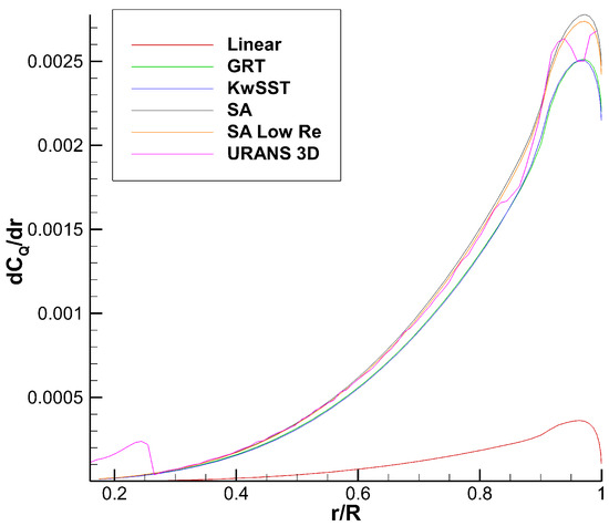 Returning to Figure A1, it can be observed that the StarCCM+ KwSST database predicts a higher lift slope and a premature stall compared with the other databases, especially for the lower Reynolds root section. It is not very clear what caused that difference, especially when considering that the transitional StarCCM+ GRT was simulated with the same mesh and seems to behave, at least qualitatively, more like the other full turbulent databases simulated with NSCODE and CHAMPS solvers. Despite its smaller lift slope in the linear region, the StarCCM+ GRT appears to be experiencing significant nonlinearities at about the same angle of attack as the in-house solvers. The comparison between GRT and KwSST gets even more confusing when realizing that the of the full turbulent KwSST is lower than the transitional GRT.
