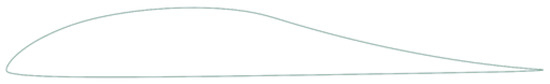 The airfoil flow occurs at low Reynolds numbers (), leading to a laminar–turbulent transition and flow separation in the airfoil surface vicinity. These changes result in an abrupt shift in the airfoil’s aerodynamic characteristics and a decrease in flight performance. At , approximately 20–30% of the airfoil length is occupied by the recirculation zone [30]. A comparison of aerodynamic characteristics among various airfoils is presented in [23,31]. In [31], a catalog of airfoils that provide high lift at low flight speeds is created using the inverse multi-point method of conformal mappings.
