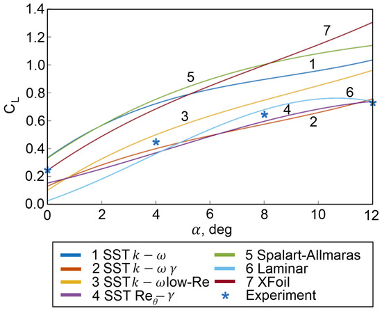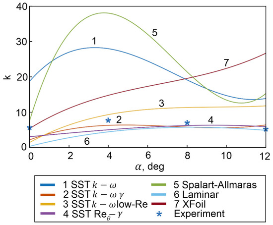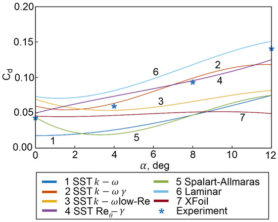 The selection of a turbulence model has a significant impact on the calculation results. The airfoil coefficients vary in a fairly wide range of values. Neglecting the laminar–turbulent transition in turbulence models results in a significant underestimation of the drag coefficient. The exploitation of SST and Spalart–Allmaras (SA) models leads to coefficients that are two to three times lower than those obtained experimentally. The laminar model causes an overestimation of the drag coefficient by about 20–30%. However, the model considering the intermittency parameter shows a fairly good agreement with the experiment both in terms of numerical values and the way in which the values of the aerodynamic coefficient of the airfoil change with the variation of the angle of attack.