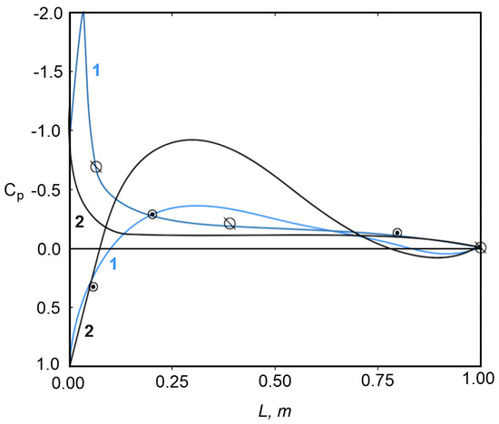 Coefficient of pressure distribution over the airfoil surface obtained using the tSST model (line 1) and SST model (line 2) in comparison with physical experiment [23] (symbols ⊘ and ⊙ refer to the top and bottom surfaces of the airfoil).