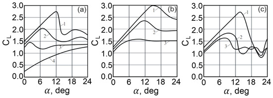 For airfoil 2, the amount of ejected air is assumed to be equal to the amount taken in through the slot. The ejection of the jet delays the onset of stalled flow regimes. At the same time, the maximum lift coefficient is almost 10% higher than the value corresponding to airfoil 1 (Figure 13b).
