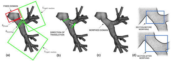 (a) Identification of edges for translation and of fixed domains with imposed rigid motion. (b) Direction of translation. (c) Mesh after morphing. (d) Effect of the morphing translation on a derived cutting plane along the direction of flow propagation of the airways model.