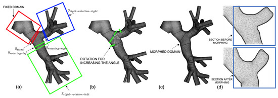 Overall, starting from controlling parameters, morphing procedures were executed within a specific cycle, each acting on a specific section. This approach enabled variations in the bronchial opening angles, enlargement of diameters in each structure, and elongation of the branches belonging to each generation. For every procedure, the surface mesh was stored and used as the starting mesh for the subsequent morphing operation. This recursive process resulted in a completely modified surface mesh based on the controlling parameters. Upon completion of the procedure, a full morphing process was also performed on the volumetric mesh, using the points of the initial surface mesh as SPs, with a displacement determined by the position of the points of the final updated surface mesh [50].