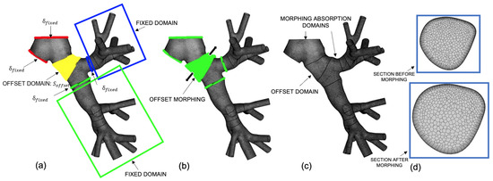 (a) The offset is applied by translating all nodes related to the surface affected by the diameter variation. (b) Offset direction for the Source Points belonging to the specific modified segment. (c) Mesh after morphing: the offset is absorbed by the upstream and downstream domains, which act as buffer zones. (d) Effect of the morphing offset on a cross-section perpendicular to the centerline of the airways model.