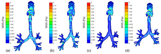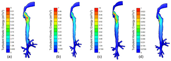 Figure 6 presents a quantitative analysis of the WSS along the inner walls of four different virtual patients (Table 2). Given the complicated geometry of the lung, which contributes to flow resistance, there is a significant variation in wall shear stress across different lung airway generations. For all the cases, the turbulent kinetic energy reaches its maximum near the larynx, subsequently starting to decrease beginning with the trachea and continually further down towards the lower generations, as shown in Figure 7 for the models created using the values reported in Table 3.