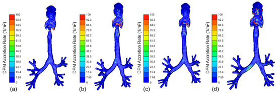 Figure 8 shows the visualization of the particle distribution of different-sized particles for four different cases (Table 4). Generally, particle deposition varies primarily based on the diameter of the particles. Particles with a smaller diameter tend to deposit more in the downstream generations compared to those with a larger diameter. The accretion rate in the upper domains also appears to increase as the inlet velocity decreases. Particle deposition is dominant in the upper airways, especially depending on the lower flow rates. This demonstrates that variations in anatomical models produce significant and strong effects worthy of consideration.