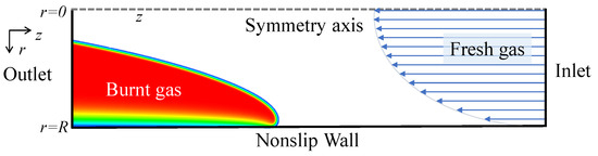 The sketch of the numerical setup is shown in Figure 1. At the outlet boundary, a subsonic outflow condition is applied. The inflow boundary is a non-reflecting inlet, used in previous studies of flames in channels [46,49,50]. A parabolic velocity profile [51] is implemented at the inlet, where is the maximum velocity at the axis and R and are the radius and the velocity components in the z direction, respectively. The tube axis is subjected to a symmetry boundary condition, i.e., symmetry is enforced, while the bottom wall is a non-slip boundary. The wall is assumed to be isothermal for all cases considered.