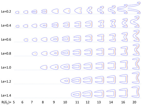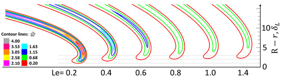 Figure 11 shows the flame shape under critical condition, represented by the isolines of the reaction rate, for different . For each snapshot, the reaction rate levels are normalized via the maximum reaction rate of the case. With the increase in Lewis number, the flame tip is shifted away from the wall, and the tip shape is modified in agreement with Figure 5. This explains why the increase in decreases the flashback tendency: as the flame tip is positioned further away from the wall, it faces a stronger flow. This finding is consistent with the results of Ref. [30].