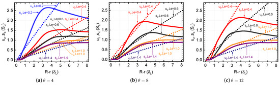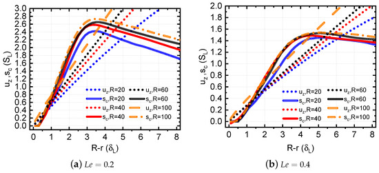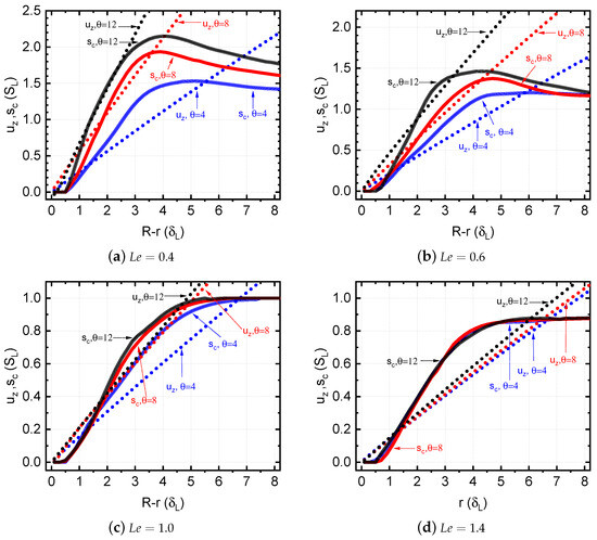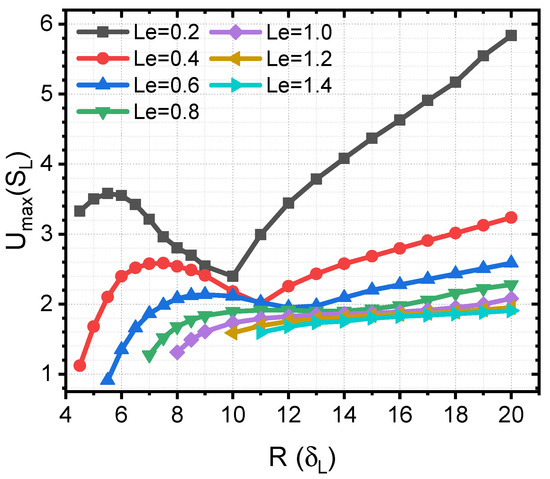 It is seen that in cases with , only a minimal difference is observed in the profiles of the consumption speed () for different . The effect of the tube radius R on the consumption speed and flow velocity in the near-wall region is illustrated in Figure 10 for two values of Lewis numbers, both for . Consistent with Figure 7, the influence of the radius R on the profiles is non-negligible for flames in the range of R considered, and it is more noticeable for the lower value of .