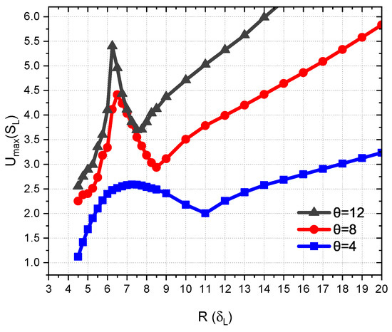 Figure 3 shows the dependence of the critical velocity on the tube radius R for different . Similar to previous studies [24,34,35], for a certain , the dependence of the critical on R is non-monotonic. Like in Refs. [24,34,35], a slight decrease in the critical velocity occurs during the shift from a mushroom- to a tulip-shaped flame, as the radius increases. For example, for , a decrease in the critical velocity with the radius R can be observed in the range , see Figure 3, followed by an increase in with R. Thus, the critical condition for flashback is strongly impacted by the flame shape transition. It is seen from Figure 2 that, when the Lewis number , the minimum tube radius, at which the critical condition can be attained without quenching, decreases with . When is greater than one, the dependence of the critical velocity on R becomes weaker with ; still, a transition in the flame shape from a mushroom-shaped flame to a tulip-shaped flame is observed.