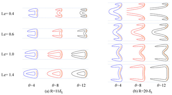 Figure 5 illustrates the flame shapes for different values of and two different radii, highlighting the influence of the Lewis number on the flame shape under the critical condition. When the Lewis number is less than unity (e.g., the top row, ), an increase in the expansion coefficient results in a more concave flame shape at the tube axis, and the tip location moves closer to the wall. In contrast, when the Lewis number is greater than unity (see, e.g., the bottom row, ), the flame shapes are less likely to be concave at the tube axis, especially for the higher values of (see, e.g., the column for ).