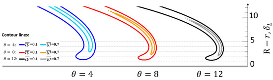 In Figure 12, flame shapes based on the isolines of the normalized reaction rate are presented for different thermal expansion coefficients . It is evident that, for a critical condition, an increase in thermal expansion coefficient results in a displacement of the reaction rate isolines towards the wall. A significant shift is observed for the isoline : as the value of increases from 4 to 12, the distance between the isoline and the wall decreases by about a third. This leads to the flame tip facing a smaller flow velocity at higher . Thus, an increase in should result in increases in the flashback tendency, corroborating the results of Figure 4.