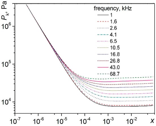 Figure 1 shows a typical dependence in a wide range of values for water at 20 °C at different frequencies of the acoustic field causing cavitation. The hydrostatic pressure is 0.1 MPa. It can be seen that with an increase in frequency, the cavitation strength increases, and with an increase in the concentration of bubbles, it first decreases sharply and then, when the concentration exceeds the value of 10−4, stabilization occurs—it strives for a constant value of cavitation strength, regardless of the concentration of bubbles.