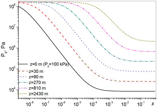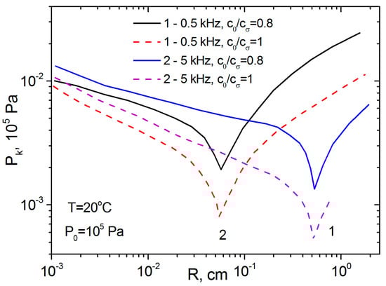 Figure 4 shows the dependences of the bubble growth thresholds at different concentrations of gas dissolved in the liquid, respectively; these concentrations are below the equilibrium concentration for a given temperature and external pressure in the liquid and equal to the equilibrium concentration . Figure 4 shows that the threshold for the growth of the vapor–gas bubbles decreases sharply with an increase in the concentration of gas dissolved in the water. Thus, the mechanism of the rectified diffusion of gas simultaneously with the mechanism of rectified heat transfer turns out to be essential for vapor–gas bubbles, and therefore, the concentration of gas dissolved in a liquid should always be taken into account when comparing theoretical and experimental results.