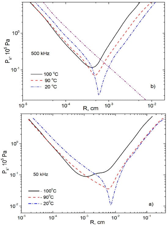 Thresholds for the growth of vapor–gas bubbles in water at frequencies of 50 kHz—(a) and 500 kHz—(b); the concentration of dissolved gas in water is below equilibrium concentration at different temperatures .