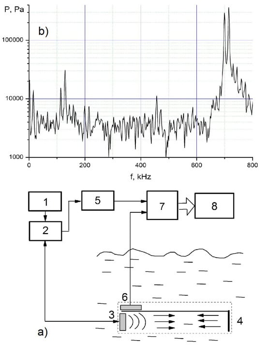 Functional diagram of the probe for measuring the nonlinear acoustic parameter of water (a) and the frequency spectrum on the receiving hydrophone (b) when emitting a biharmonic signal of 698 kHz and 716 kHz: 1—path of generation and emission of parametric pulses; 2—switch of radiation-reception signals; 3—parametric emitter; 4—reflecting plate; 5—selective difference frequency signal amplifier; 6—depth sensor; 7—two-channel ADC; 8—computer.