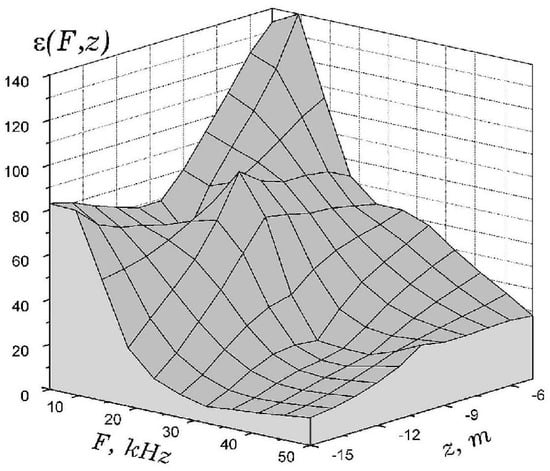 The function depends on the concentration of bubbles in the near-surface layer, the value of which in turn varies depending on the depth. At the same time, the value of the nonlinear parameter also changes. Figure 6 shows a near-surface layer with a characteristic thickness of h~5–10 m, depending on the frequency. Summarizing the results discussed above, we can propose the following empirical dependences of the nonlinear parameter on frequency and on depth: