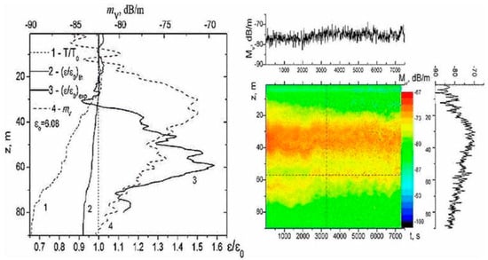 From the comparison of the calculated and experimental results for and (curves 2 and 3), it can be seen that these results differ significantly, which indicates that the nonlinearity in seawater is mainly due to the presence of the micro-heterogeneities of various origins in it. Curve 4 in Figure 7 on the right shows the measurements of the sound scattering coefficient at a frequency of 100 kHz. A comparison of the obtained results shows that the change in the nonlinearity parameter diverges from the maximum absolute values of the sound scattering coefficients , and a significant change is observed slightly below the maximum horizon ; it coincides with the position of the internal wave, which is usually present at the boundaries of the sound scattering layers, in places of large gradients of the sound scattering coefficient.