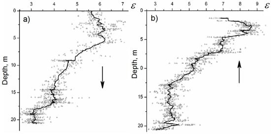 Dependences of the nonlinearity parameter on the depth in the water area of Vityaz Bay (the Sea of Japan) with different soundings: (a)—from the surface to a depth of 21 m, (b)—from a depth of 21 m upwards.
