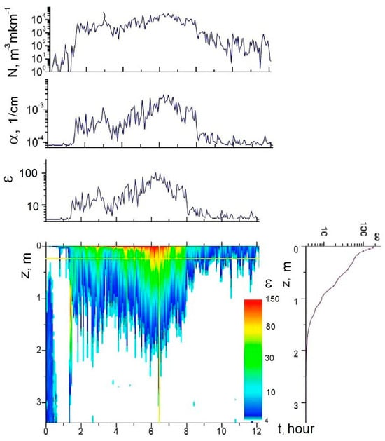 Figure 8 shows the dependence of the nonlinearity parameter on the depth in the water area of Vityaz Bay (the Sea of Japan) when lowering the meter from the surface to a depth of 21 m, in the absence of sea waves. The results indicate the presence of a pronounced near-surface layer up to 5–10 m thick with increased nonlinearity, which is observed even in relatively calm water without wave collapse and the formation of bubble clouds.