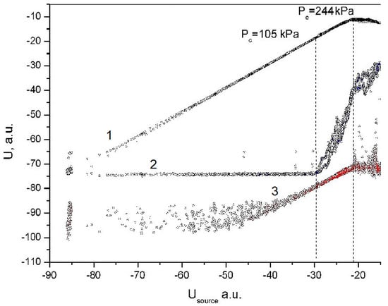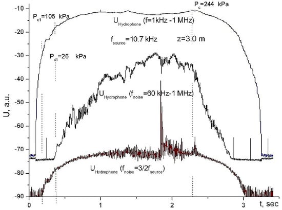 Figure 11 shows the time dependences of various spectral components of acoustic noise: a subharmonic signal at a frequency of , total harmonics in the frequency range from 1 kHz to 1 MHz, and higher harmonics , starting from the 6th harmonic 64.2 kHz. The depth at which the model of the cavitation strength meter was located was 3 m. It can be seen that the first threshold of kPa corresponds to the beginning of cavitation, and the second threshold of kPa, located in the asymptotic section , corresponds to the beginning of violent cavitation.