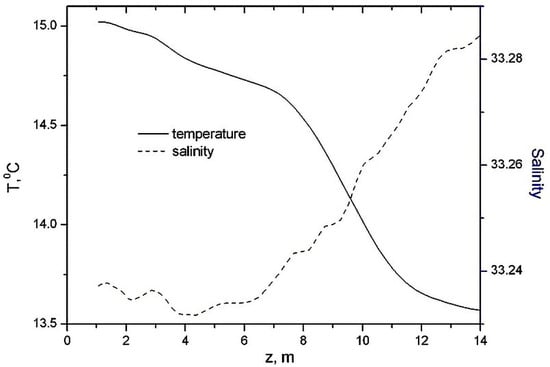 The experimental studies of the cavitation strength of seawater were carried out in the autumn period in the Vityaz Bay of the Peter the Great Gulf of the Sea of Japan. Figure 12 shows the temperature and salinity distributions of seawater depending on the depth. It can be seen that there is a clearly defined upper mixed layer with quasi-homogeneous temperature and salinity, extending to a depth of about 6–8 m. Below is a pronounced jump layer characterized by the high vertical gradients of the hydrophysical parameters of seawater.