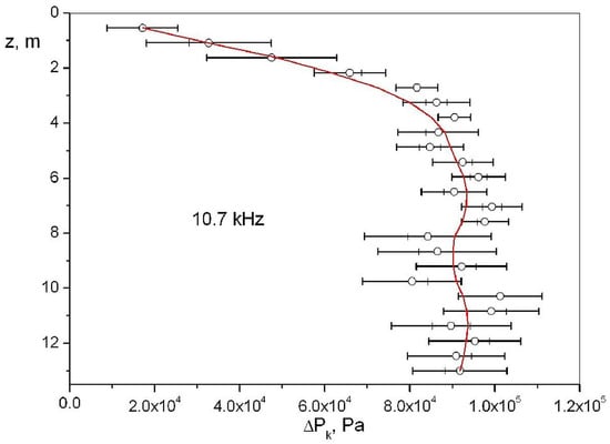 Figure 13 shows the cavitation strength of seawater as a function of depth, measured in a series of experiments in the same place in Vityaz Bay, the hydrology of which corresponds to Figure 12. The voltage continuously changed during probing. So, the measurements of each point of cavitation strength were carried out in a certain depth range of about 0.5 m. The individual points in Figure 13 correspond to the specified depth intervals. The data on the first cavitation threshold were taken as a cavitation criterion. The measurement errors of the cavitation strength are indicated on the graph and partly reflect the statistical nature of acoustic cavitation.