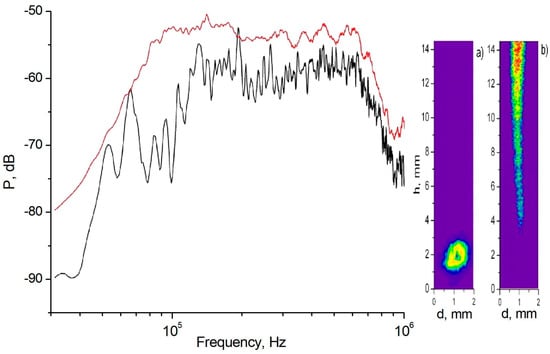 The spectrum of acoustic emission in various separate forms of laser breakdown of water: on the surface (b)—black line and in the water column (a)—red line.