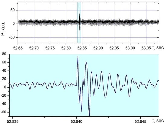 Figure 18 shows the dependence of the sound pressure P on the leading edge of the acoustic pulse on the energy E. Let us analyze the dependence of acoustic emission on the dynamics of bubbles. The method of analysis is as follows. The total energy of the acoustic pulse is calculated as: