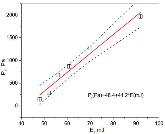 The dependence of the sound pressure P on the leading edge of the acoustic pulse on the energy E: experimental points, linear approximation by the formula indicated on the graph (solid line) and 96% confidence interval of approximation (dashed lines).