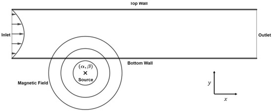 In the previous flow, the main objective was to study the fluid flow in a channel under various circumstances, such as the application of a uniform, constant in magnitude, magnetic field vertical to the flow. The FHD case is a slightly different problem. In FHD, the magnetic field is generated from a source (point) outside or inside the flow.