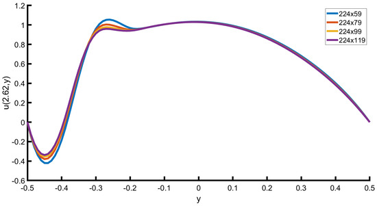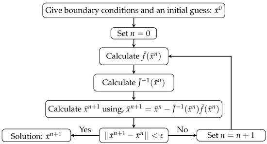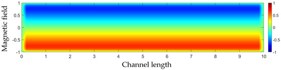 In this subsection, the behaviour of an electrically conducting fluid is studied while an external magnetic field, constant in magnitude, is applied. In this case, it is assumed that the magnetic field is applied vertically to the flow, meaning that the magnetic field b is a function of the variable y or . A similar assumption can be considered for the u-velocity, . Along with many applications of this flow, this is a test problem due to the fact that, with a known analytical solution, the numerical solution obtained by the algorithm developed can be validated.