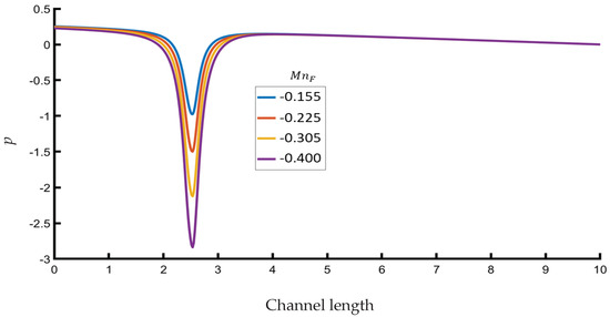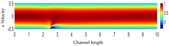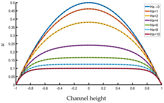 Remark 1. Let us assume a parabolic profile in the inlet, no slip conditions on the walls, and Neumann conditions at the channel outlet. The Lorentz force will create thin boundary layers which, in this case, are called Hartmann layers, as well as a decrease in the fluid velocity, as the magnitude of the magnetic field increases. This will also be proven by the analytical solution provided in a later section where the greater the value of the Hartmann number is, the greater the drop of the velocity is.