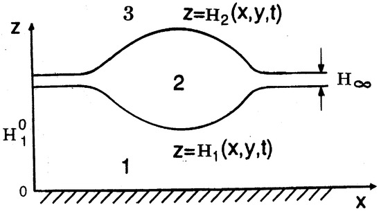 In the framework of the lubrication approximation, the velocity and pressure fields are enslaved to the deformations of interfaces. The temporal evolution of those deformations is governed by the volume conservation equations [18]: