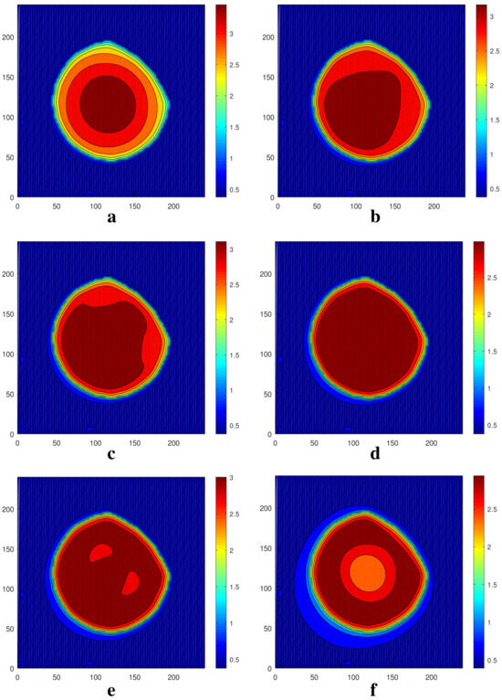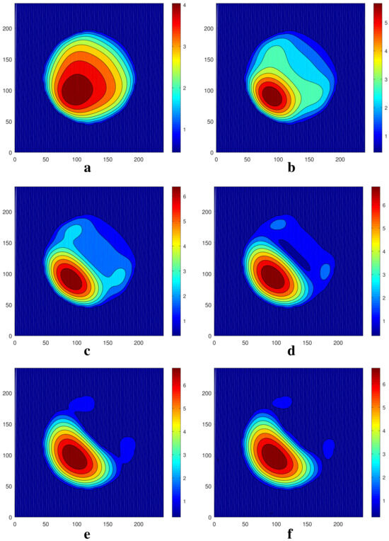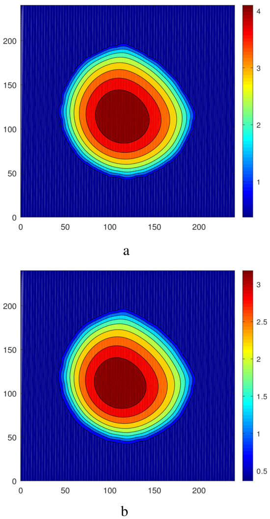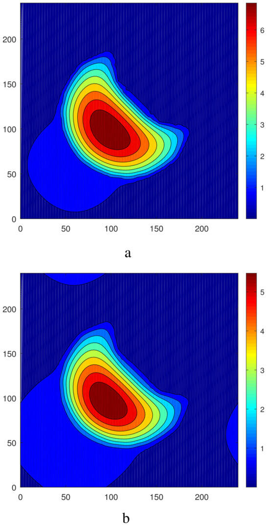 Let us consider now the action of an increased temperature modulation, , on the initially round steady droplet. The intermediate states of the evolution of the initially round droplet under the action of two-dimensional temperature modulation are presented in Figure 4. As in the previous case, in the early stages the liquid in the droplet moves to the left bottom part of the computational region (Figure 4a,b). A visible change in the droplet’s shape takes place between Figure 4a,c. One can see the division of the droplet and the creation of two satellites that are symmetric with respect to the axes (see Figure 4e,f). With an increase in time (at 100,000), the further evolution of the droplet and the equilibration takes place. Finally, we obtain a steady droplet with the maximum significantly shifted along the axis to the region . A snapshot of the fields of (a) and (b) at the equilibrium stage is shown in Figure 5 and the corresponding shapes of interfaces are presented in Figure 6. The droplet keeps the symmetry with respect to the axis . One can see that the droplet becomes much shorter in the direction of the axis (see Figure 5). Let us note that the droplet is significantly higher than that obtained in the case (cf. Figure 3 and Figure 5).