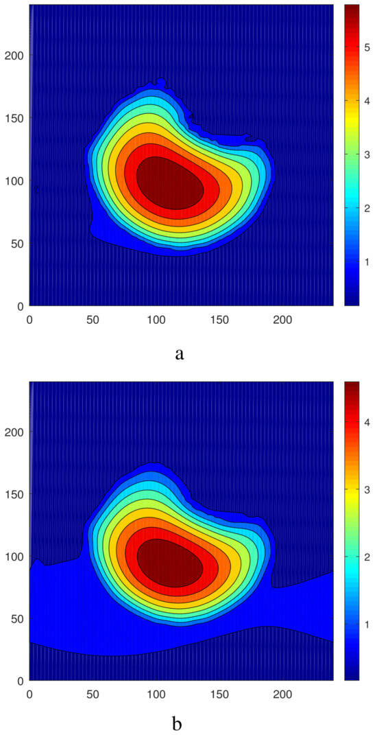 Let us take now the steady droplet with the maximum, shifted to the left part of the computational region (see Figure 3 in [25]), as the initial conditions and consider its evolution under the action of two-dimensional temperature modulation (; ). Despite the symmetry of the spatial temperature modulation, we obtain an asymmetric steady state. A snapshot of the fields of (a) and (b) is shown in Figure 9, and the shapes of the interfaces are presented in Figure 10.