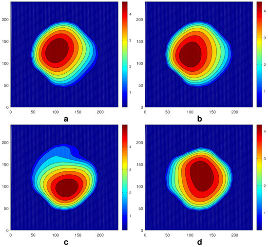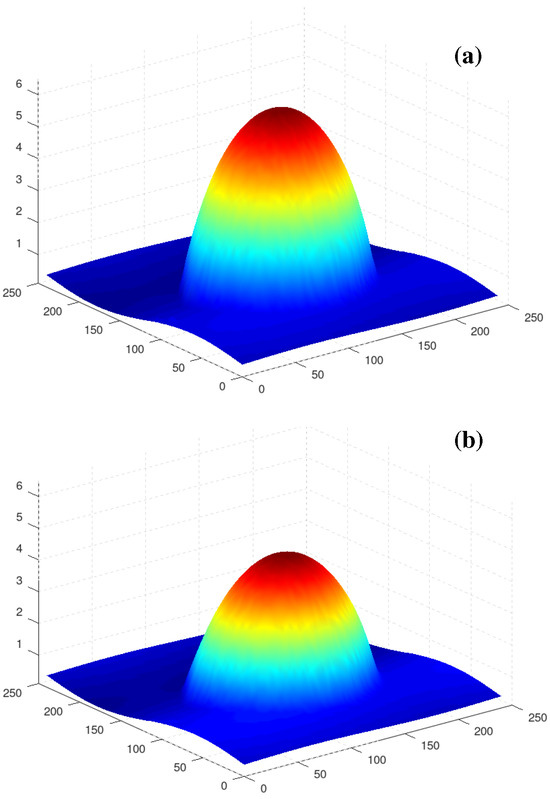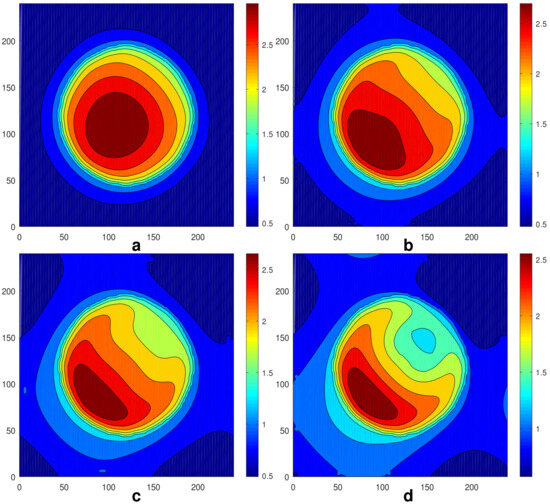 Thus, the substrate temperature inhomogeneity has the shape of a square pattern. The function is symmetric with respect to axes , , and . It changes its sign on the lines and . Near the diagonal , it is negative for and positive for . Under the action of the thermocapillary stresses, the liquid in the droplet moves slowly towards the region , , changing its shape and height. The intermediate stages of the evolution of the initially round droplet are presented in Figure 2. A change in the droplet’s shape is visible between Figure 2a,c. At 200,000, the equilibration takes place. Finally, we obtain the steady droplet with the maximum, shifted along the axis to the region , where the local value of is higher (i.e., into the cooler part of the region). Figure 3 shows a snapshot of the fields of (a) and (b) at the equilibrium stage. The droplet is not round anymore, but it keeps the symmetry with respect to the axis .