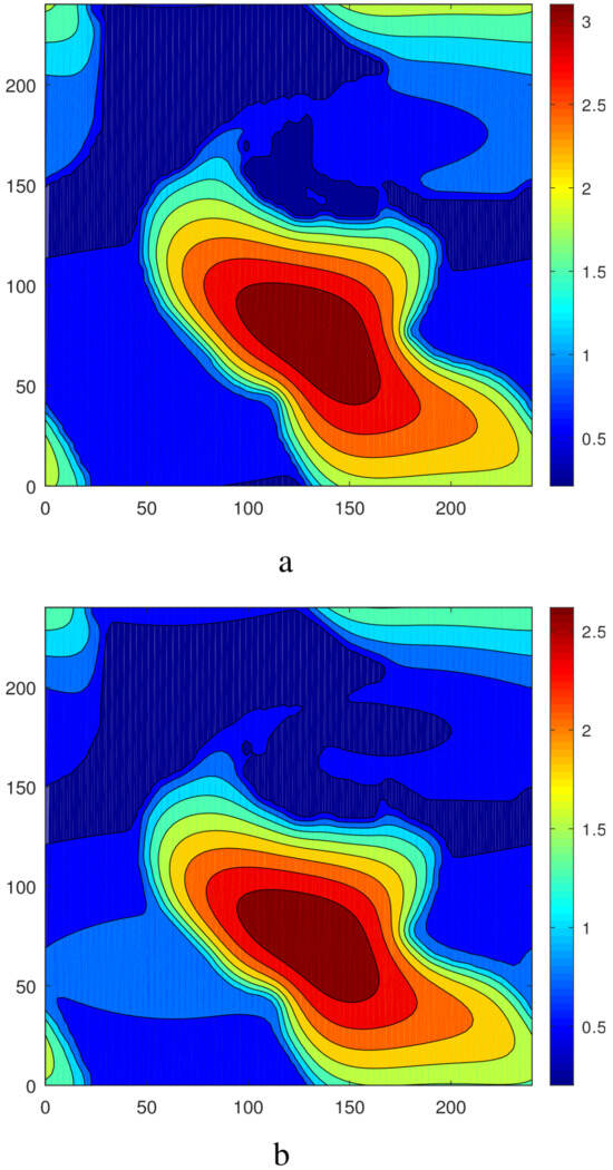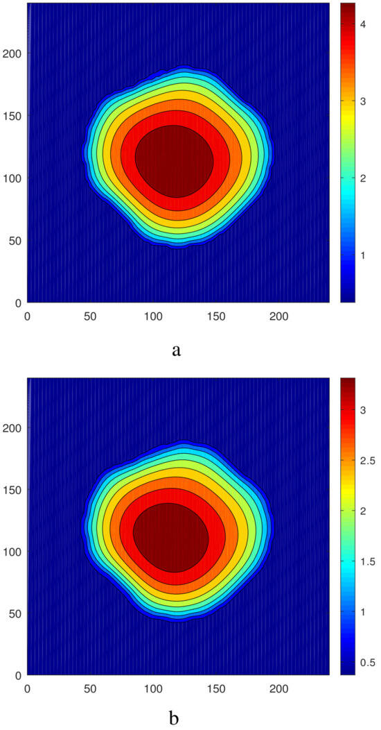 Let us take as initial conditions the periodic oscillations presented in Figure 19 and Figure 20a. Under the action of sufficiently small gravity (), oscillations are suppressed and the steady droplet develops in the system. A snapshot of the fields of (a) and (b) is shown in Figure 29. The height of the droplet is essentially lower than that obtained in the absence of gravity (cf. Figure 20a and Figure 29a).