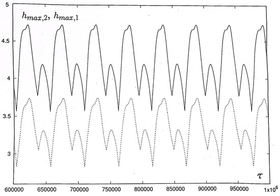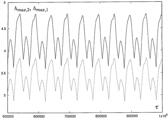 Let us take the oscillatory flow presented in Figure 19 and Figure 20a as the initial condition and consider its evolution at the larger values of . With an increase in , periodic oscillations with different adjacent maxima become of a rather complex form; the amplitude of oscillations grows and the period of oscillations decreases (cf. Figure 23 ( 52,940) and Figure 19 ( 69,420)). At , quasiperiodic oscillations develop in the system (see Figure 24).