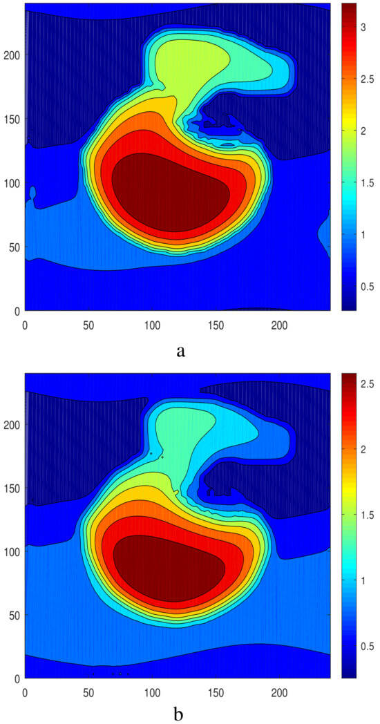 The problem governed by Equations (6)–(10) and (12)–(15) has been solved numerically with some initial conditions. The evolution equations were discretized using central differences for spatial derivatives and solved using an explicit scheme. Periodic boundary conditions have been applied on the boundaries of the computational region .