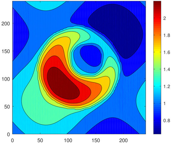 Now, let us take as initial conditions the periodic oscillations presented in Figure 19 and Figure 20a. With a decrease in (at ), oscillations are suppressed and the steady asymmetric droplet develops in the system. A snapshot of the field of is shown in Figure 34. Let us note that the asymmetric droplet has also been obtained for sufficiently small values of and (, ). The isolines and the shape of the upper interface, corresponding to the final equilibrium state, are shown in Figure 35 and Figure 36. One can see that the symmetry with respect to axis is broken.