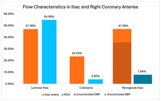Each patient underwent an evaluation of flow dynamics and arterial phenomena in both iliac and right coronary arteries. For each artery, data were categorized based on the following parameters: laminar versus non-laminar antegrade flow, presence versus absence of retrograde flow, and presence versus absence of collisions. Additionally, we analyzed the relationship between retrograde flow and blood pressure, with a particular focus on the association with uncontrolled diastolic blood pressure exceeding 80 mmHg in the iliac artery. Artificial intelligence algorithms were used to detect the retrograde flow.